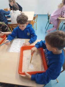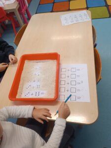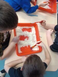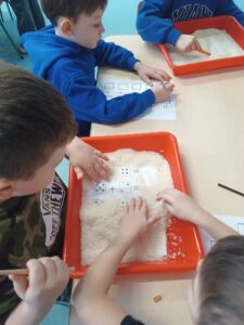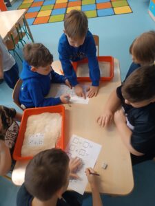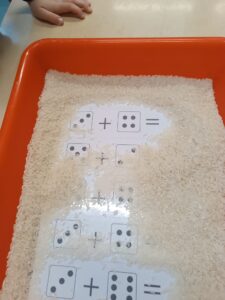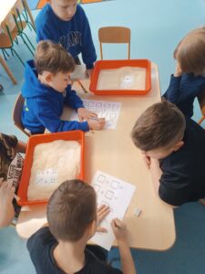 W ramach realizacji zadania Sensoryczna matematyka w przedszkolu Jantarek w Gdyni przeprowadzono zajęcia z sensowyszukiwanki. Celem zadania było odnaleźć pod warstwą ryżu działania matematyczne, a następnie zapisać je na kartce i rozwiązać działania. Dzieci doskonaliły dodawanie i odejmowanie w zakresie 1-6 świetnie się bawiąc.